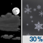 Forecast: A chance of rain showers between 1am and 5am, then a chance of snow showers. Partly cloudy. Low around 26, with temperatures rising to around 33 overnight. West northwest wind 3 to 18 mph, with gusts as high as 30 mph. Chance of precipitation is 30%.