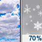 Temperature: 11°F Wind Speed: 5 to 10 mph Wind Direction: NW Forecast: Snow likely. Mostly cloudy, with a high near 11. Chance of precipitation is 60%. New snow accumulation of 2 to 4 inches possible. |