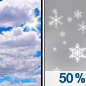 Temperature: 25°F Wind Speed: 0 to 5 mph Wind Direction: SW Forecast: A chance of snow after 2pm. Mostly cloudy, with a high near 25. Southwest wind 0 to 5 mph. Chance of precipitation is 50%. New snow accumulation of less than half an inch possible. |