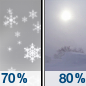 Temperature: 25°F Wind Speed: 20 to 24 mph Wind Direction: NW Forecast: Snow showers likely before noon, then snow showers and patchy blowing snow. Cloudy, with a high near 25. Wind chill values as low as -2. Northwest wind 20 to 24 mph. Chance of precipitation is 80%. New snow accumulation of 1 to 2 inches possible. |