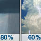 Temperature: 63°F Wind Speed: 10 to 15 mph Wind Direction: SW Forecast: Rain showers before noon, then showers and thunderstorms likely. Mostly cloudy, with a high near 63. Chance of precipitation is 80%. |