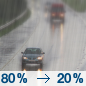 Temperature: 45°F Wind Speed: 12 to 15 mph Wind Direction: W Forecast: Rain before 1pm. Mostly sunny, with a high near 45. Chance of precipitation is 80%. |