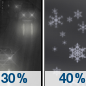 Temperature: 30°F Wind Speed: 12 mph Wind Direction: SW Forecast: A slight chance of rain and snow. Partly cloudy, with a low around 30. Chance of precipitation is 20%. |