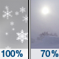 Temperature: 36°F Wind Speed: 3 to 7 mph Wind Direction: SW Forecast: A chance of snow. Partly sunny, with a high near 36. New snow accumulation of less than half an inch possible. |