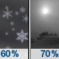 Temperature: 14°F Wind Speed: 3 to 10 mph Wind Direction: SSW Forecast: A chance of snow before 4pm. Cloudy. High near 14, with temperatures falling to around 11 in the afternoon. South southwest wind 3 to 10 mph. Chance of precipitation is 50%. New snow accumulation of less than half an inch possible. |