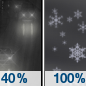 Temperature: 32°F Wind Speed: 10 to 20 mph Wind Direction: NW Forecast: Snow before 10am, then a chance of snow showers between 10am and 1pm. Mostly cloudy, with a high near 32. Northwest wind 10 to 20 mph, with gusts as high as 40 mph. Chance of precipitation is 100%. New snow accumulation of 2 to 4 inches possible. |