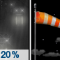Temperature: 38°F Wind Speed: 7 to 12 mph Wind Direction: W Forecast: A chance of rain. Mostly cloudy, with a low around 38. West wind 7 to 12 mph. Chance of precipitation is 40%. |