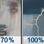 Temperature: 50°F Wind Speed: 6 to 15 mph Wind Direction: S Forecast: Rain and patchy fog and a slight chance of thunderstorms before midnight, then patchy fog and a slight chance of rain between midnight and 3am, then a chance of rain and patchy fog. Cloudy. Low around 50, with temperatures rising to around 56 overnight. South wind 6 to 15 mph, with gusts as high as 26 mph. Chance of precipitation is 100%. New rainfall amounts between a quarter and half of an inch possible. |
