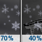 Temperature: 27°F Wind Speed: 5 mph Wind Direction: S Forecast: Snow likely before midnight, then scattered snow showers between midnight and 1am, then a chance of freezing rain between 1am and 3am. Mostly cloudy, with a low around 27. South wind around 5 mph. Chance of precipitation is 70%. New snow accumulation of less than half an inch possible. Little or no ice accumulation expected. |