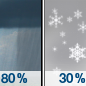 Temperature: 4°F Wind Speed: 5 to 20 mph Wind Direction: NW Forecast: A slight chance of snow before midnight. Mostly cloudy, with a low around 4. Northwest wind 5 to 20 mph, with gusts as high as 30 mph. Chance of precipitation is 20%. |
