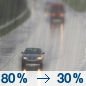 Forecast: Rain between 7am and 2pm. Partly sunny. High near 61, with temperatures falling to around 39 in the afternoon. West wind 8 to 16 mph, with gusts as high as 26 mph. Chance of precipitation is 80%. New rainfall amounts less than a tenth of an inch possible.