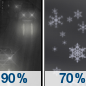 Temperature: 13°F Wind Speed: 6 to 13 mph Wind Direction: W Forecast: Snow before 4am. Mostly cloudy, with a low around 13. West wind 6 to 13 mph, with gusts as high as 23 mph. Chance of precipitation is 80%. New snow accumulation of 1 to 2 inches possible. |