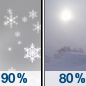 Temperature: 12°F Wind Speed: 9 to 16 mph Wind Direction: W Forecast: Snow showers likely. Mostly cloudy, with a low around 12. West wind 9 to 16 mph, with gusts as high as 29 mph. Chance of precipitation is 70%. New snow accumulation of 1 to 2 inches possible. |