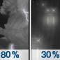 Temperature: 41°F Wind Speed: 5 to 10 mph Wind Direction: W Forecast: Showers and thunderstorms before midnight, then a chance of rain. Mostly cloudy, with a low around 41. Chance of precipitation is 80%. |