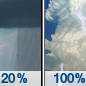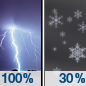Temperature: 20°F Wind Speed: 14 to 22 mph Wind Direction: SW Forecast: Showers and thunderstorms before midnight, then a chance of rain and snow showers. Mostly cloudy. Low around 20, with temperatures rising to around 28 overnight. Southwest wind 14 to 22 mph, with gusts as high as 32 mph. Chance of precipitation is 100%. New snow accumulation of less than half an inch possible. |