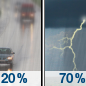 Temperature: 69°F Wind Speed: 3 to 8 mph Wind Direction: SE Forecast: A chance of rain between 9am and 4pm, then rain likely and a slight chance of thunderstorms. Cloudy, with a high near 69. Southeast wind 3 to 8 mph. Chance of precipitation is 70%. New rainfall amounts between a quarter and half of an inch possible. |