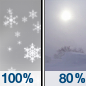 Temperature: 34°F Wind Speed: 3 to 7 mph Wind Direction: WSW Forecast: A chance of snow. Mostly cloudy, with a high near 34. New snow accumulation of less than half an inch possible. |