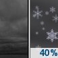 Temperature: 6°F Wind Speed: 5 to 10 mph Wind Direction: N Forecast: A chance of snow after midnight. Cloudy. Low around 6, with temperatures rising to around 9 overnight. North wind 5 to 10 mph. Chance of precipitation is 40%. New snow accumulation of less than half an inch possible. |