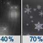 Temperature: 34°F Wind Speed: 7 mph Wind Direction: W Forecast: A slight chance of snow after noon. Mostly cloudy, with a high near 34. West wind around 7 mph. Chance of precipitation is 20%. |