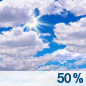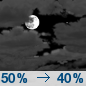 Temperature: 35°F Wind Speed: 5 to 9 mph Wind Direction: W Forecast: Mostly cloudy, with a low around 35. Chance of precipitation is 50%. |