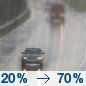 Temperature: 54°F Wind Speed: 5 to 14 mph Wind Direction: S Forecast: Rain likely after 7am. Mostly cloudy, with a high near 54. Chance of precipitation is 70%. |